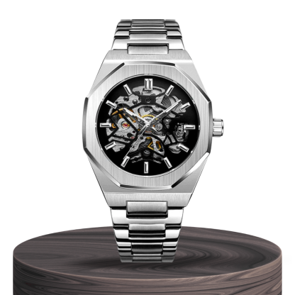 Crafted to command attention, this mechanical watch features an open dial, luminous markers, and a stainless steel band. Designed for those who appreciate bold aesthetics with mechanical precision.