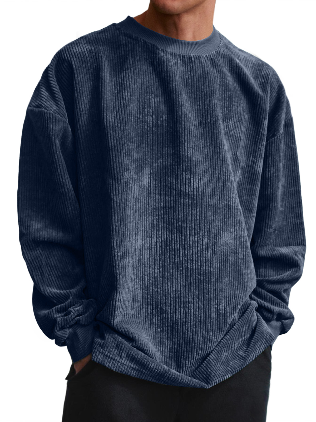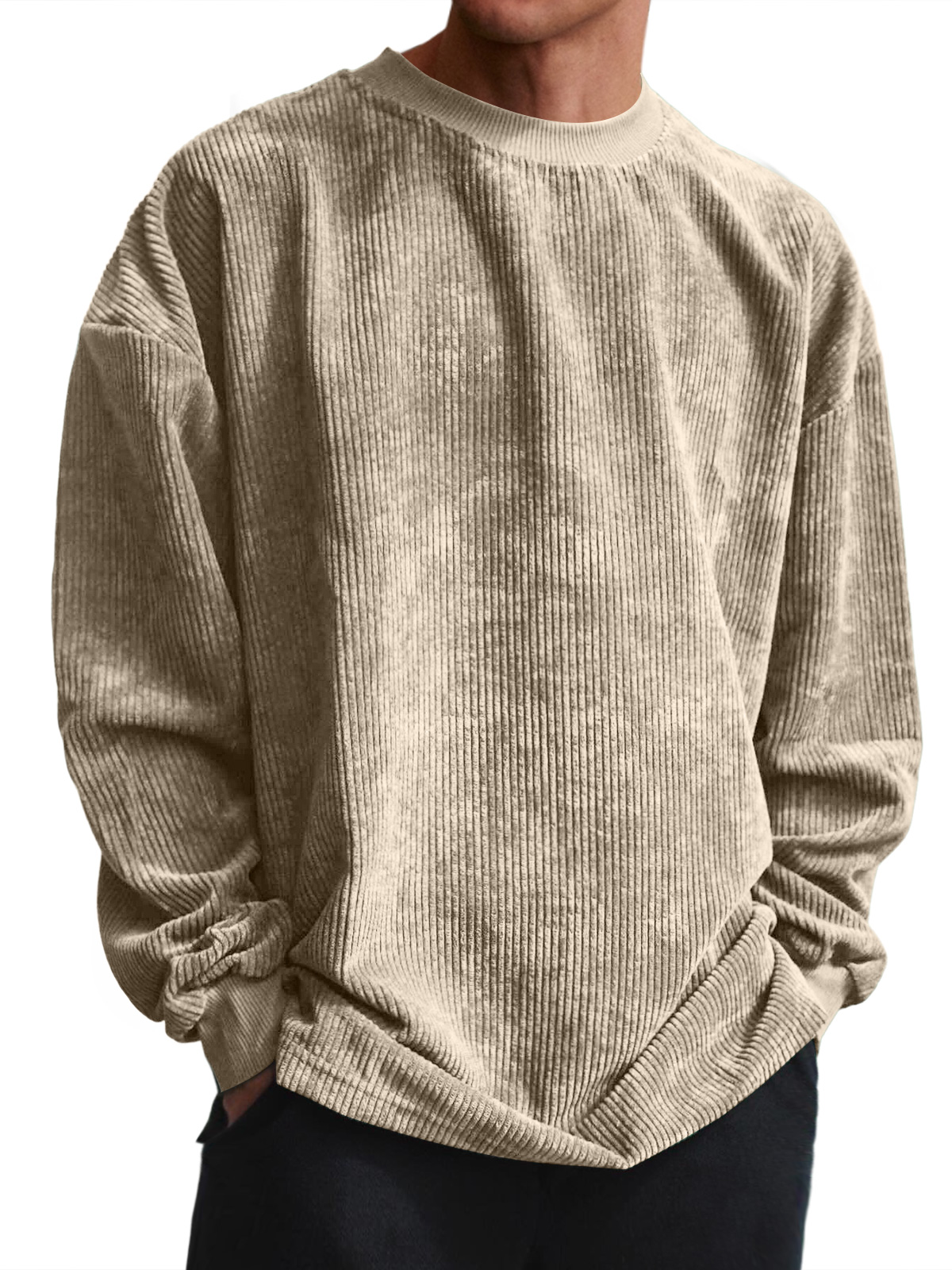 Men's Casual Round Neck Pit Stripe Textured Solid Color Long-sleeved T-shirt