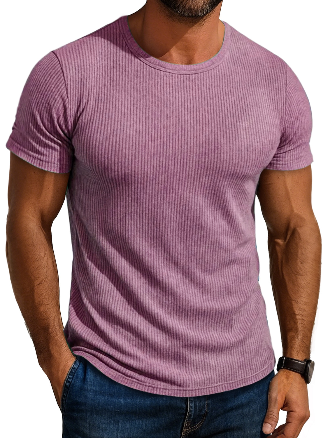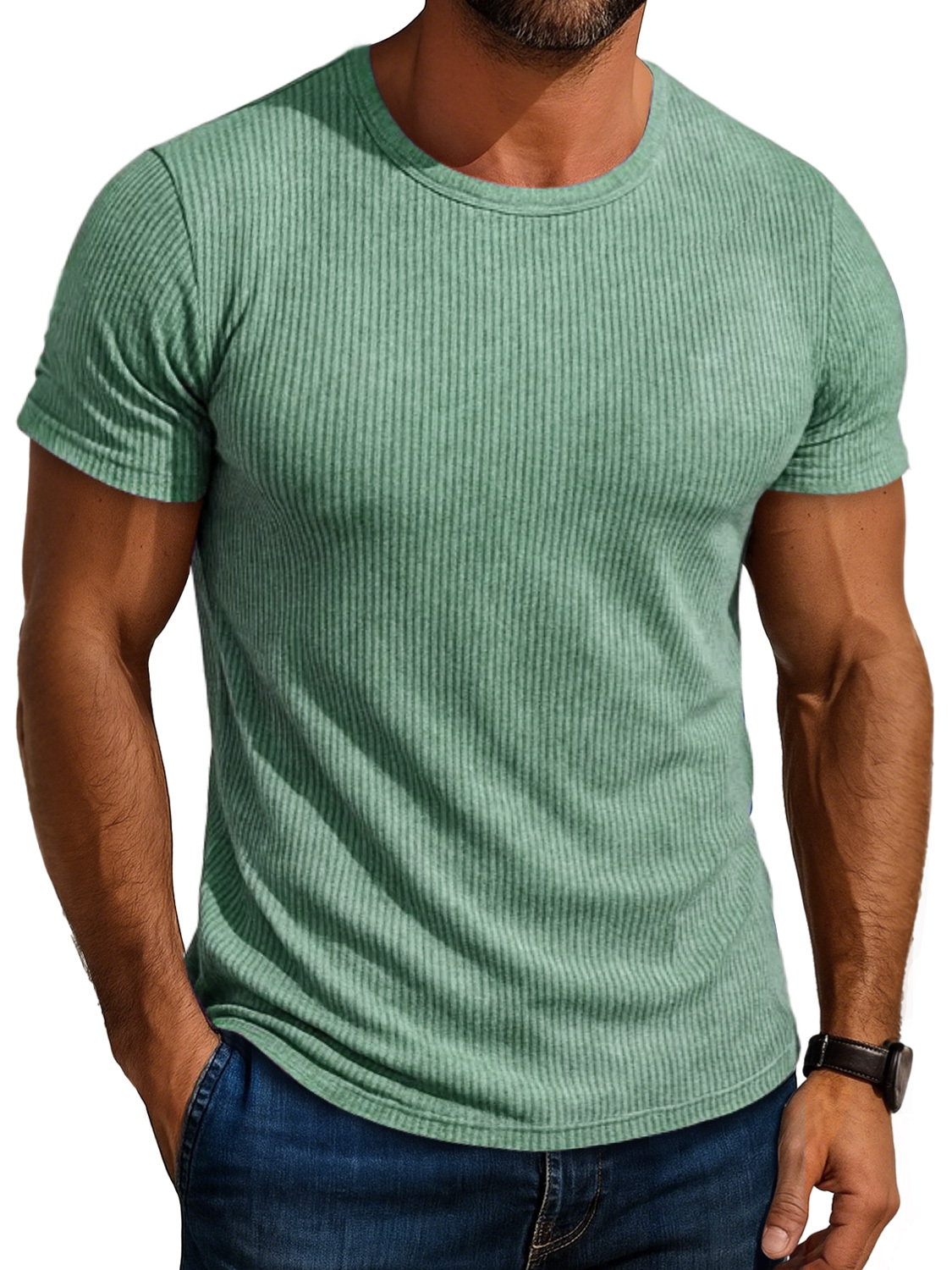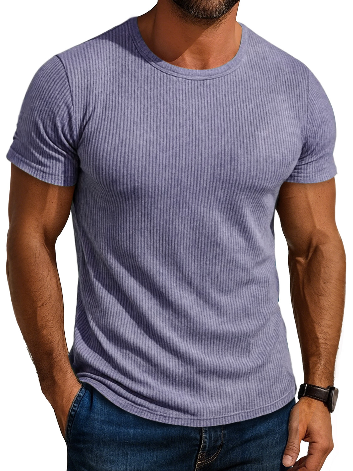 Men's Daily Round Neck Ribbed Casual Comfortable Solid Color Short-sleeved T-shirt