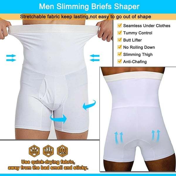 Our slimming compression shorts - your FAT-BURNING ASSISTANT will tighten the 'beer belly' in the front, shorten the "love handles" on the sides, eliminate back fat, tighten loose skin after weight loss, lift your buttocks, and compress your thighs. It is a men's slimming waist trainer body shaper, but also a type of men's compression underwear boxer shorts.